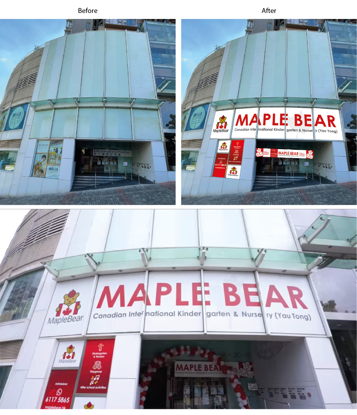 Following the brand image of Maple Bear provided by International, I created window stickers and billboards for the campus privacy with different key images and messages for prospect.